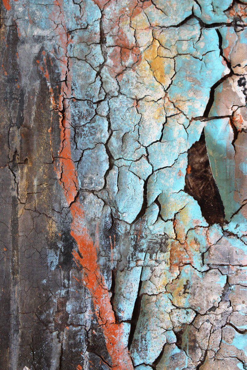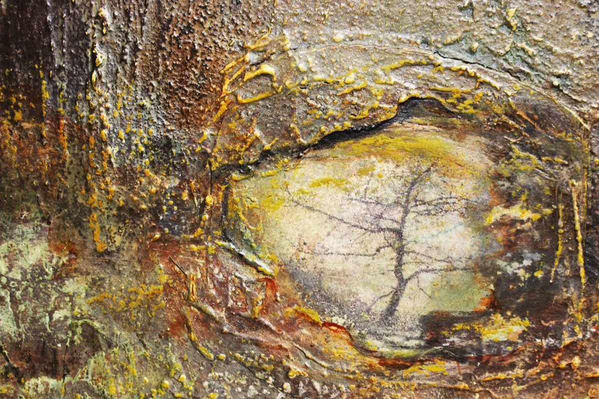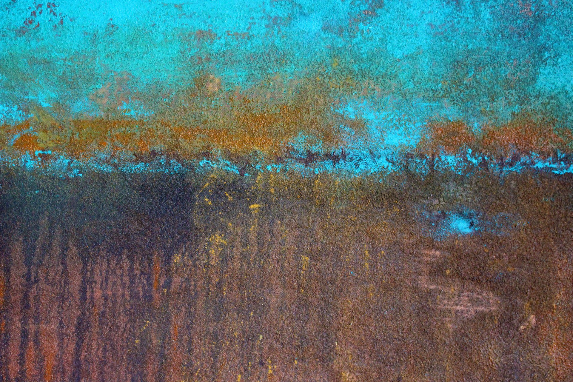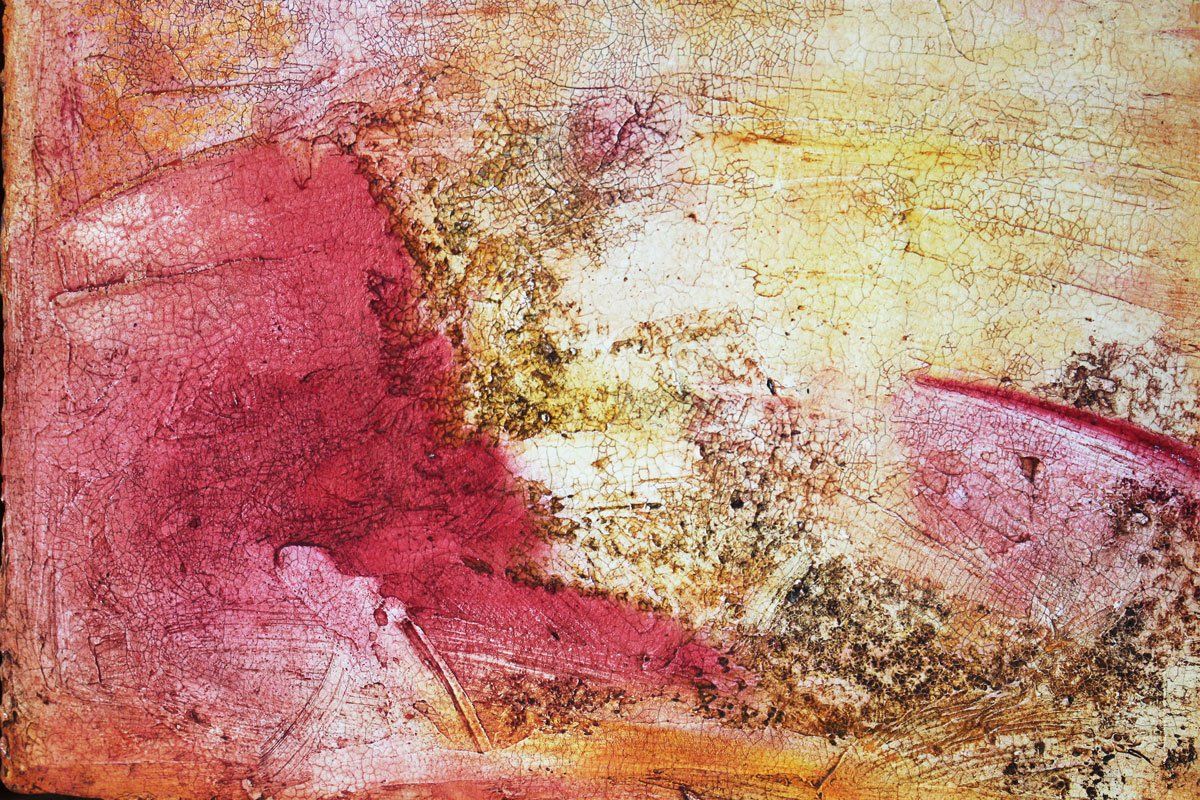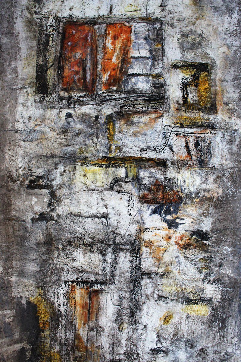 Spannend finde ich den Einsatz von Rosteffekten und die Arbeit mit Knochenleim auf unterschiedlichen Maluntergründen wie Schalbrettern, Pappen und Styropor. Die abstrakten aber auch figürlichen Motive sind überwiegend von Zufällen geprägt. Ein Bild besteht meist aus mehreren Aufträgen und Schichten und wirkt dadurch haptisch. Nach dem Durchtrocknungsprozess werden Farbpigmente mithilfe geeigneter Bindemittel wie Eitempera, Kasein, Wachs oder Acrylemulsion eingearbeitet. Die dabei willkürlich gebildeten Risse geben dem Bild den einzigartigen, reizvollen Charakter.