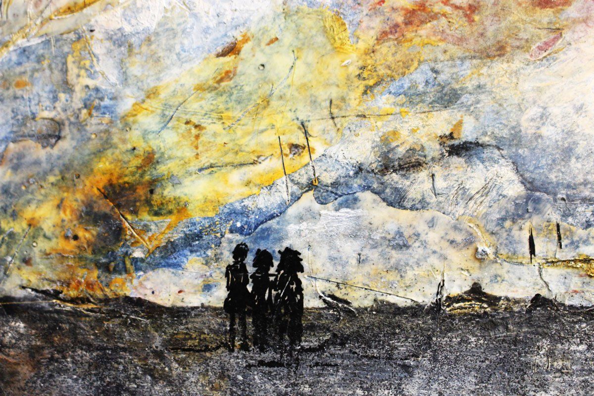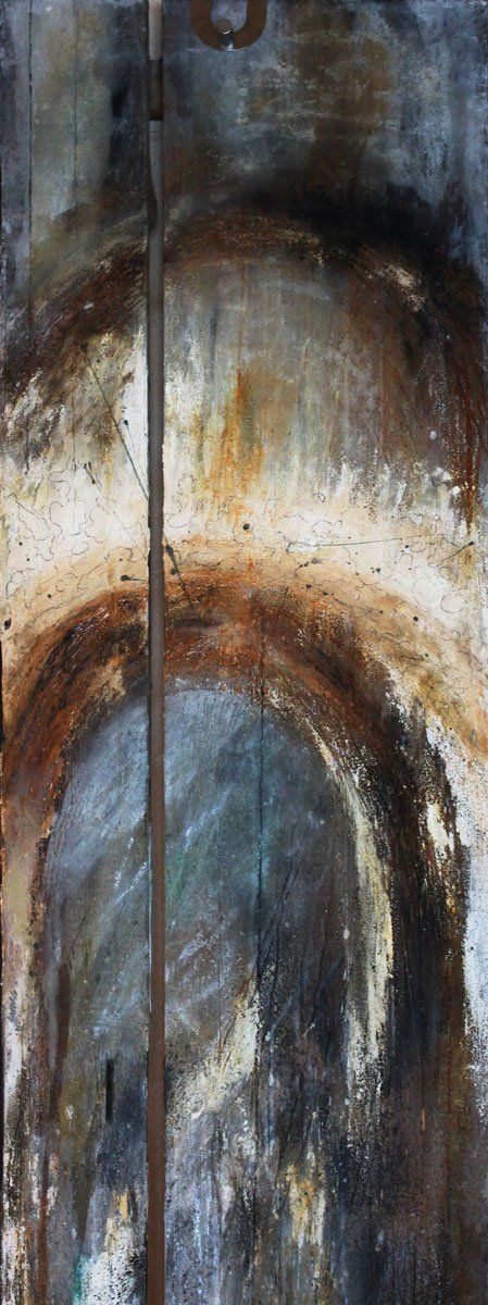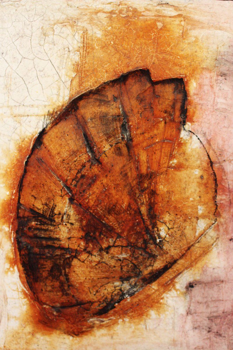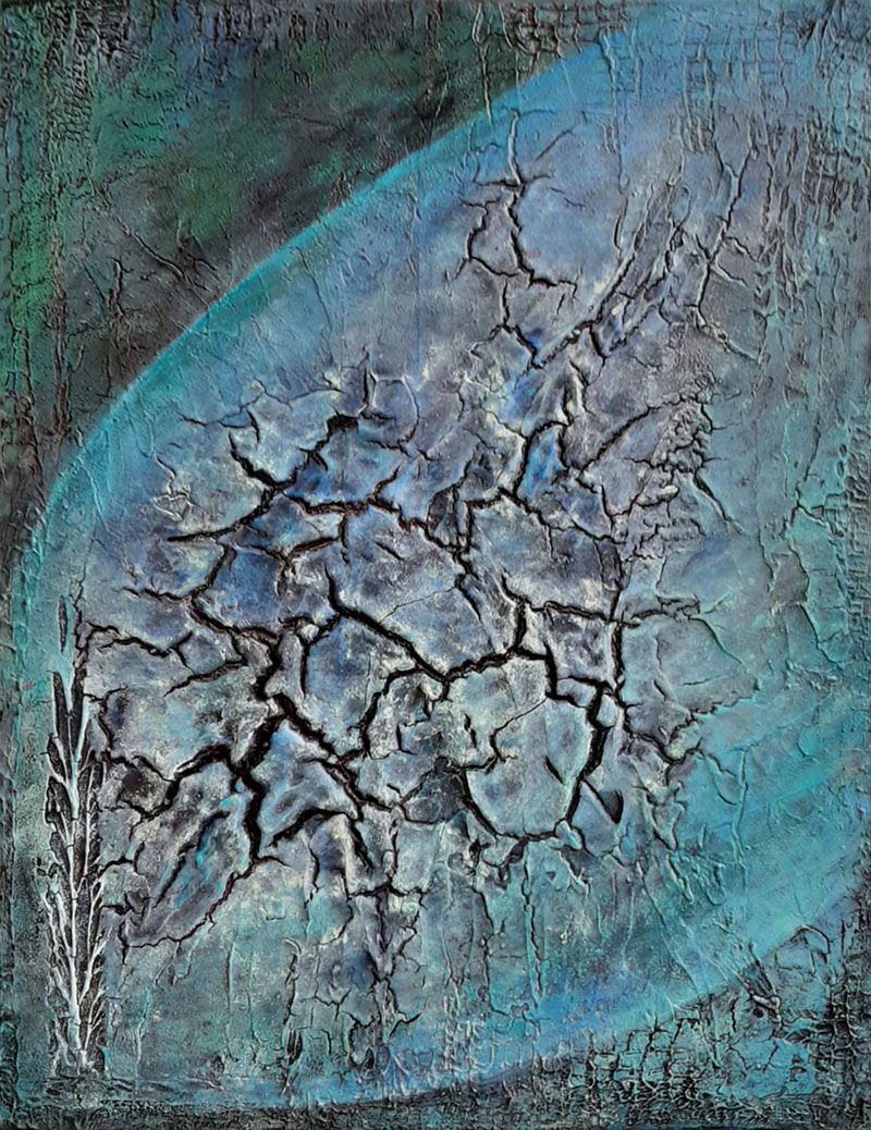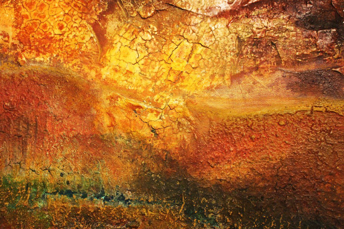 Spannend finde ich den Einsatz von Rosteffekten und die Arbeit mit Knochenleim auf unterschiedlichen Maluntergründen wie Schalbrettern, Pappen und Styropor. Die abstrakten aber auch figürlichen Motive sind überwiegend von Zufällen geprägt. Ein Bild besteht meist aus mehreren Aufträgen und Schichten und wirkt dadurch haptisch. Nach dem Durchtrocknungsprozess werden Farbpigmente mithilfe geeigneter Bindemittel wie Eitempera, Kasein, Wachs oder Acrylemulsion eingearbeitet. Die dabei willkürlich gebildeten Risse geben dem Bild den einzigartigen, reizvollen Charakter.