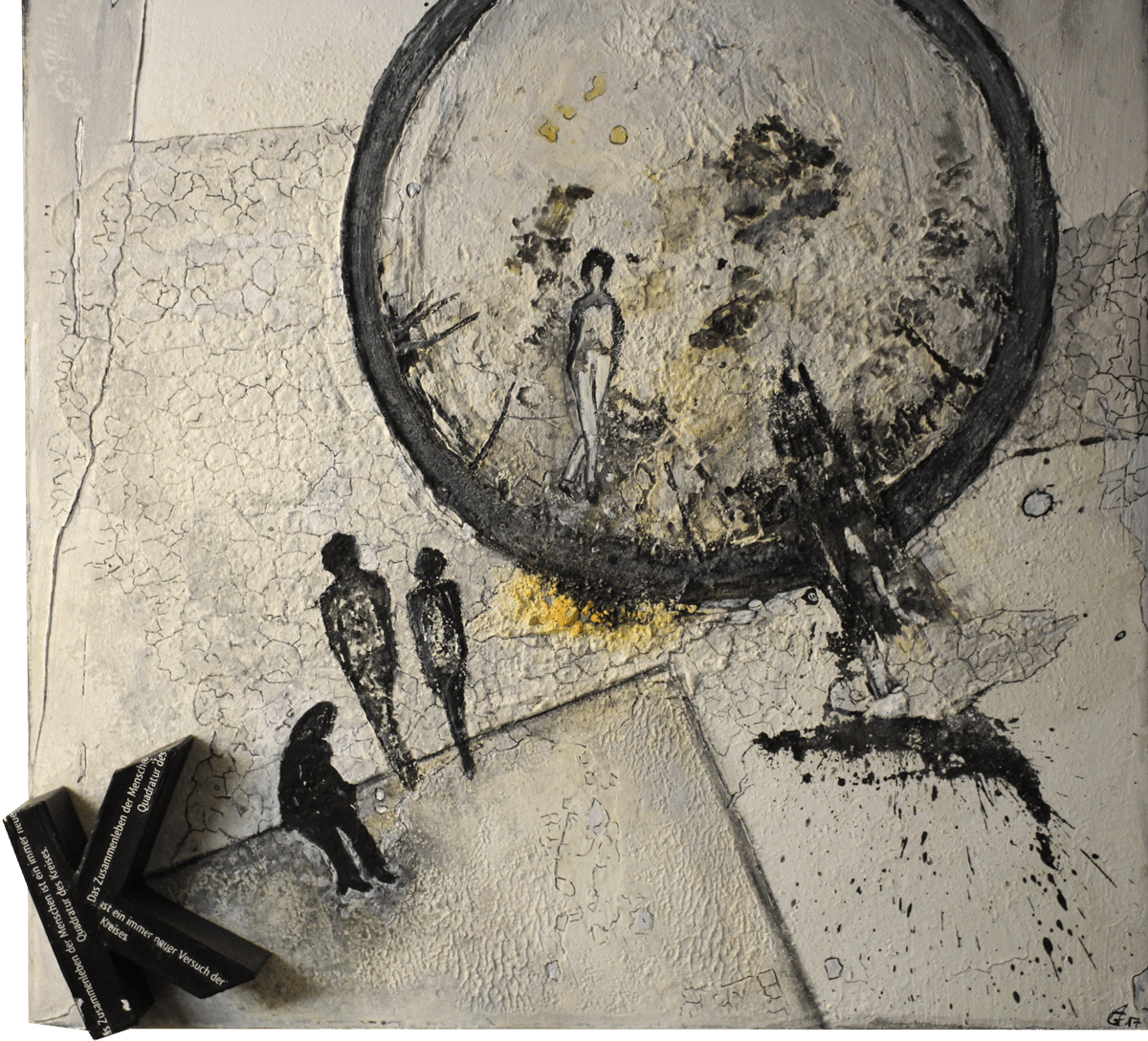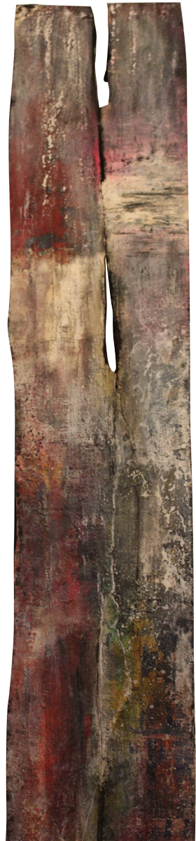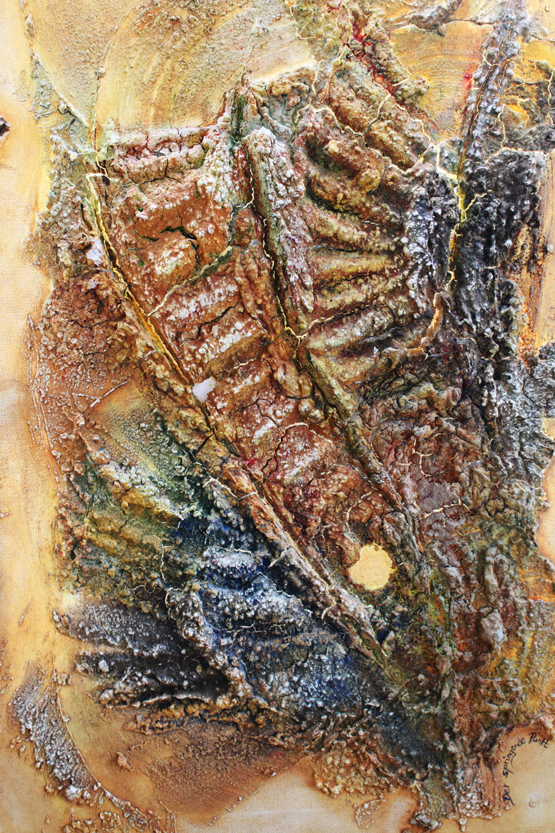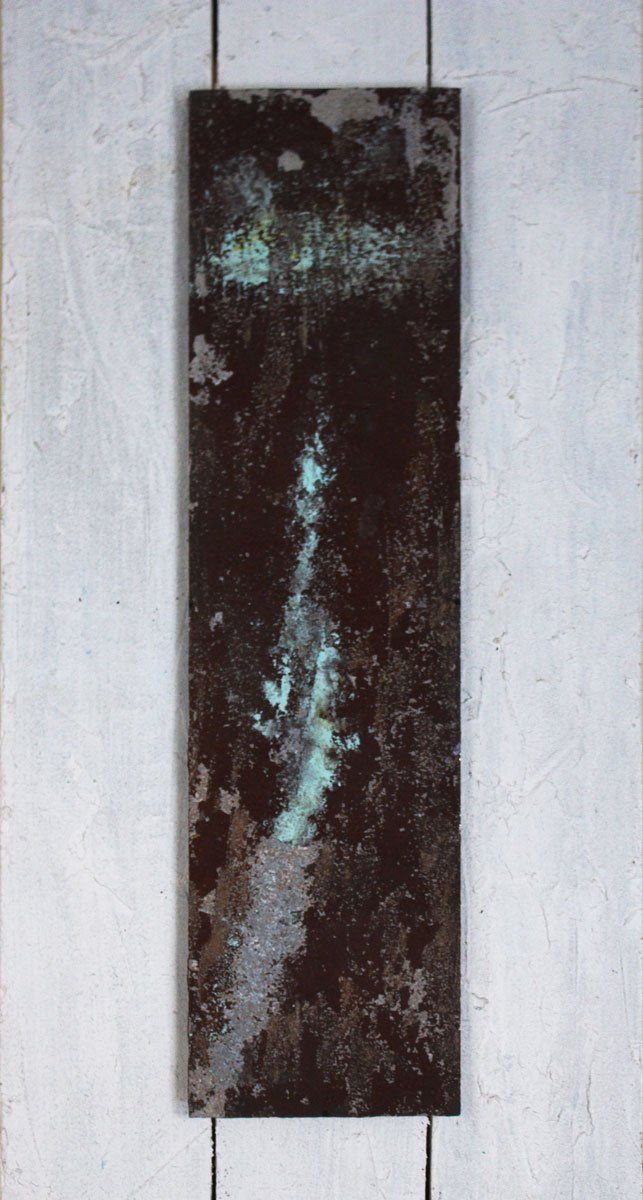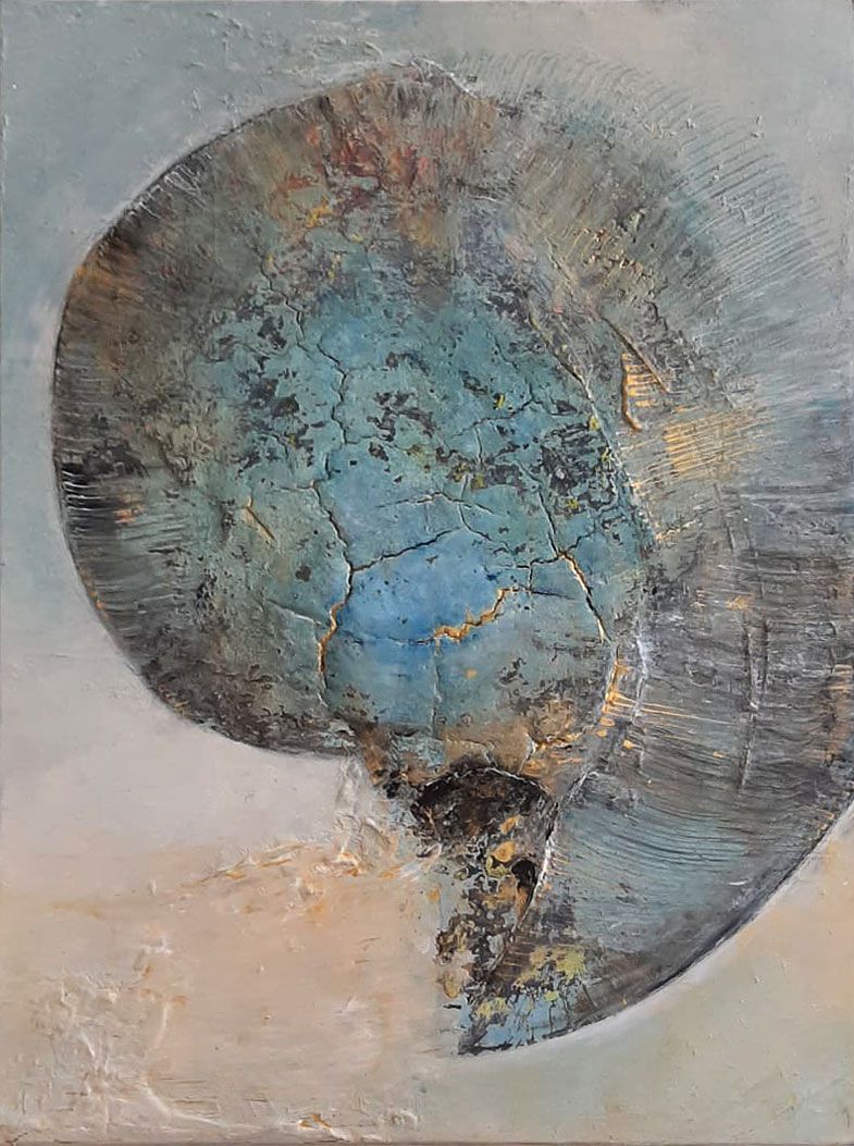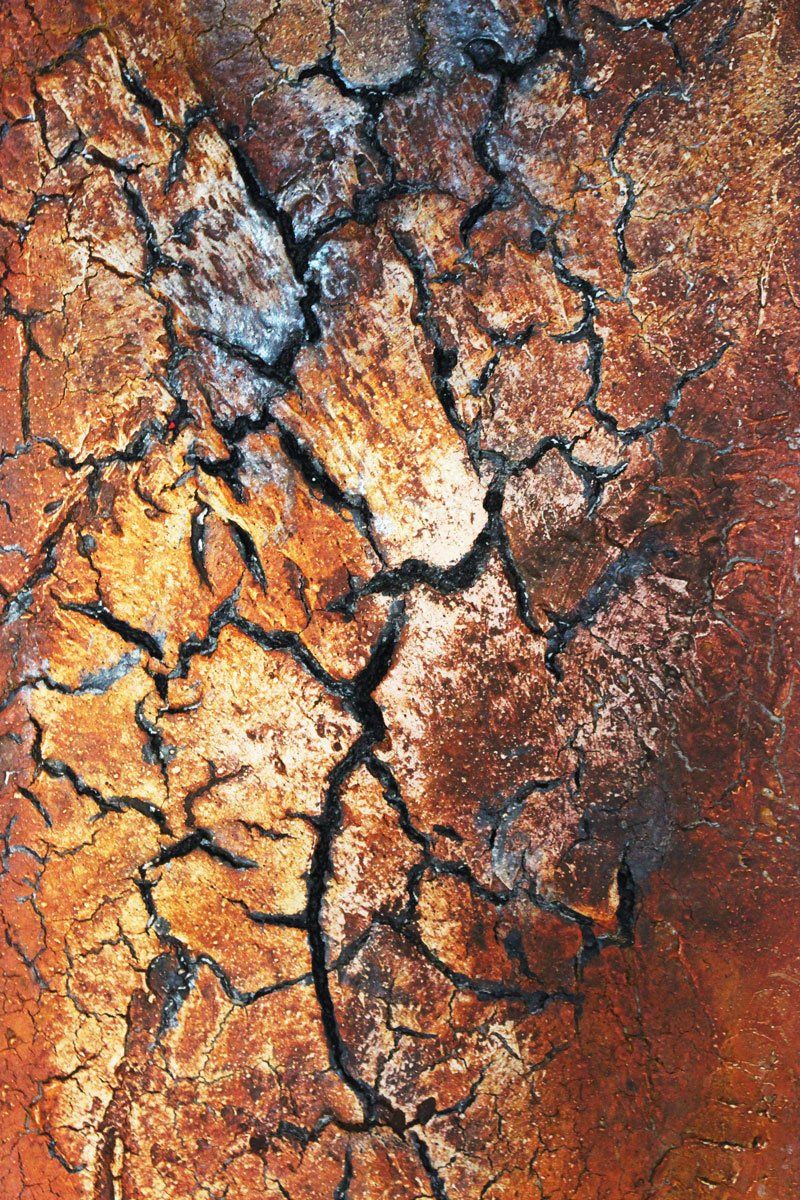 Spannend finde ich den Einsatz von Rosteffekten und die Arbeit mit Knochenleim auf unterschiedlichen Maluntergründen wie Schalbrettern, Pappen und Styropor. Die abstrakten aber auch figürlichen Motive sind überwiegend von Zufällen geprägt. Ein Bild besteht meist aus mehreren Aufträgen und Schichten und wirkt dadurch haptisch. Nach dem Durchtrocknungsprozess werden Farbpigmente mithilfe geeigneter Bindemittel wie Eitempera, Kasein, Wachs oder Acrylemulsion eingearbeitet. Die dabei willkürlich gebildeten Risse geben dem Bild den einzigartigen, reizvollen Charakter.